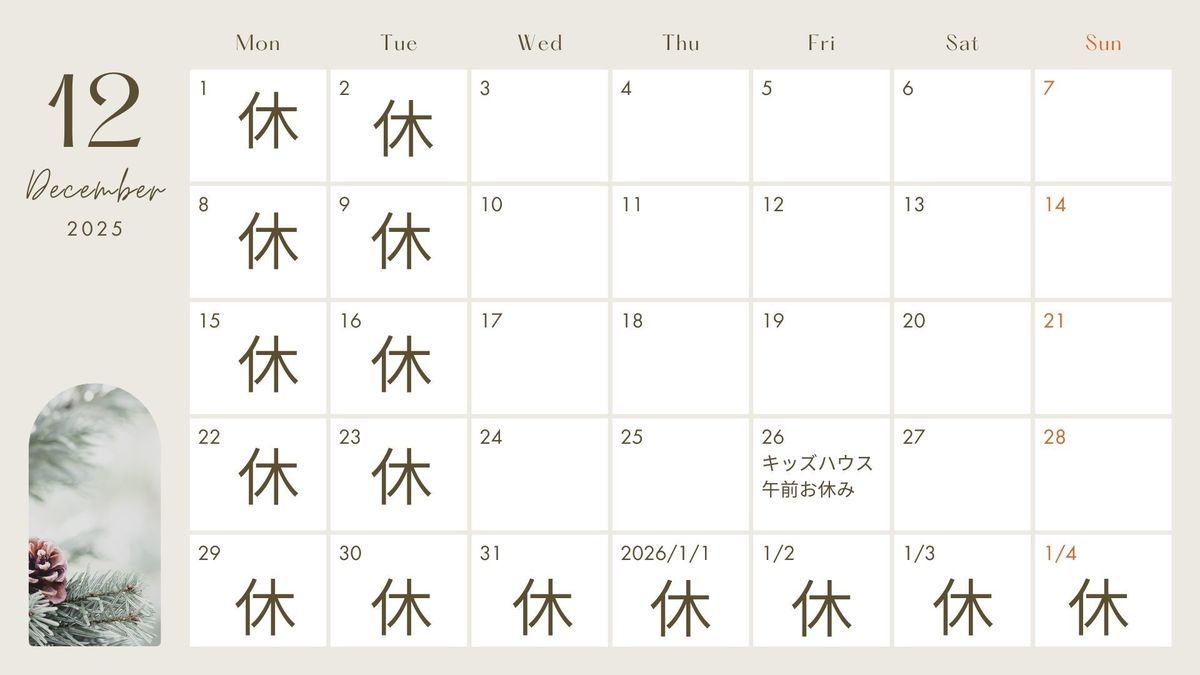 年末年始ですが、29日(月)~2026/1/6(火)までお休みとなります。